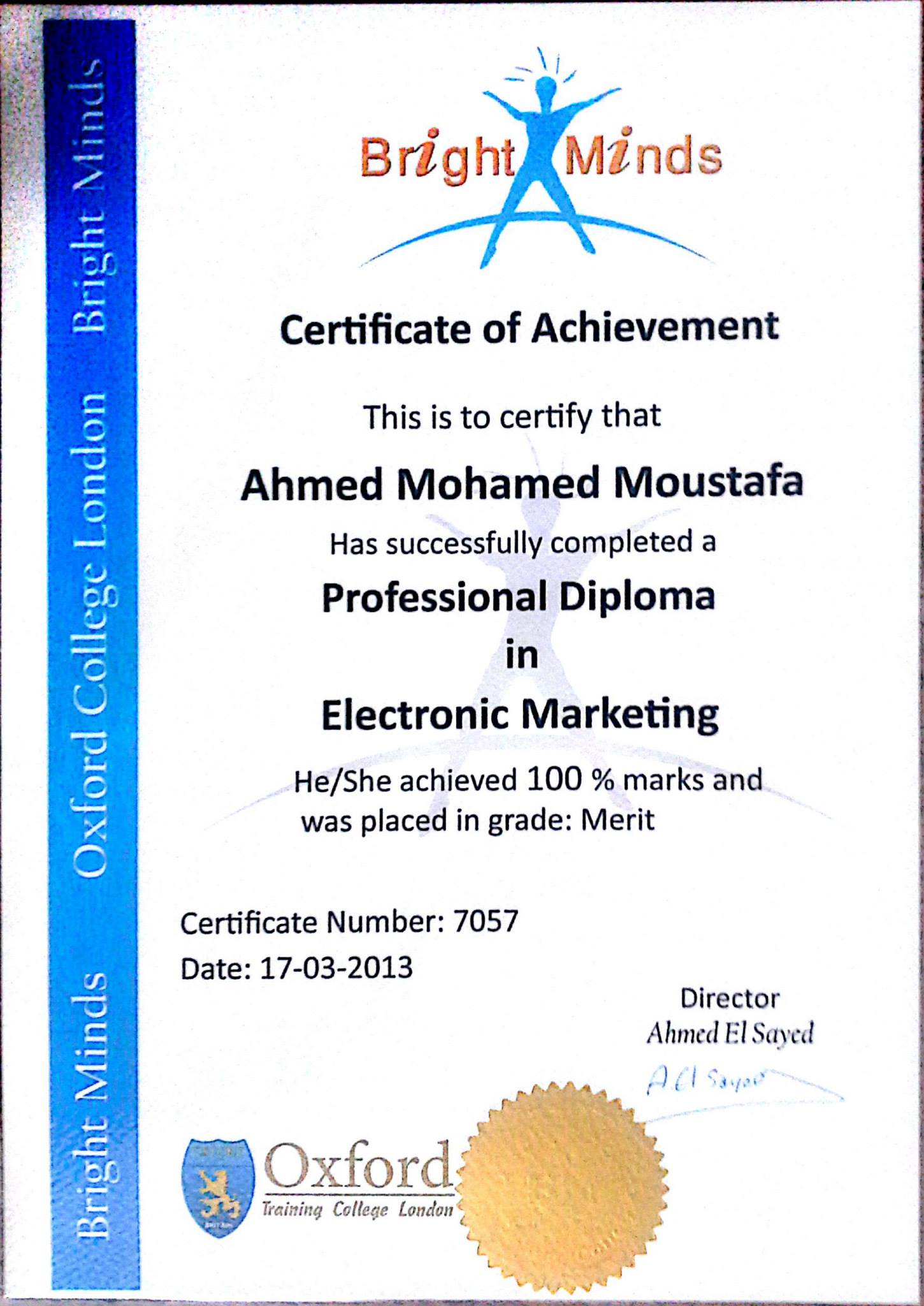 An advanced diploma in electronic marketing that expanded my capabilities in digital campaign planning, online promotion strategies, and brand communication.